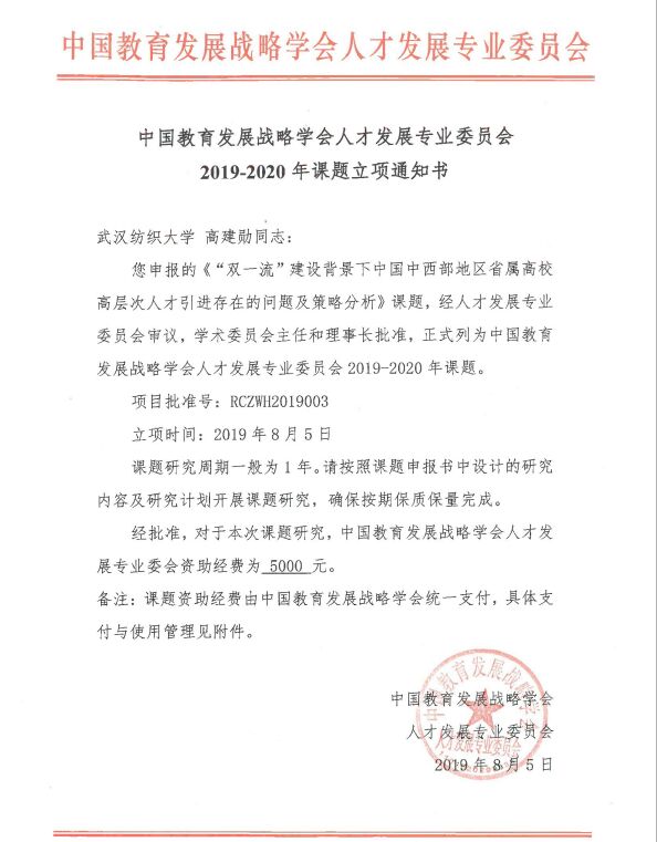 近日,中国教育发展战略学会人才发展专业委员会公布了2019-2020年度课题立项名单,伟德党委教师工作部部长、人事处处长高建勋教授主持申报的《“双一流”建设背景下中国中西部地区省属高校高层次人才引进存在的问题及策略分析》课题喜获立项,获批资助经费5000元。