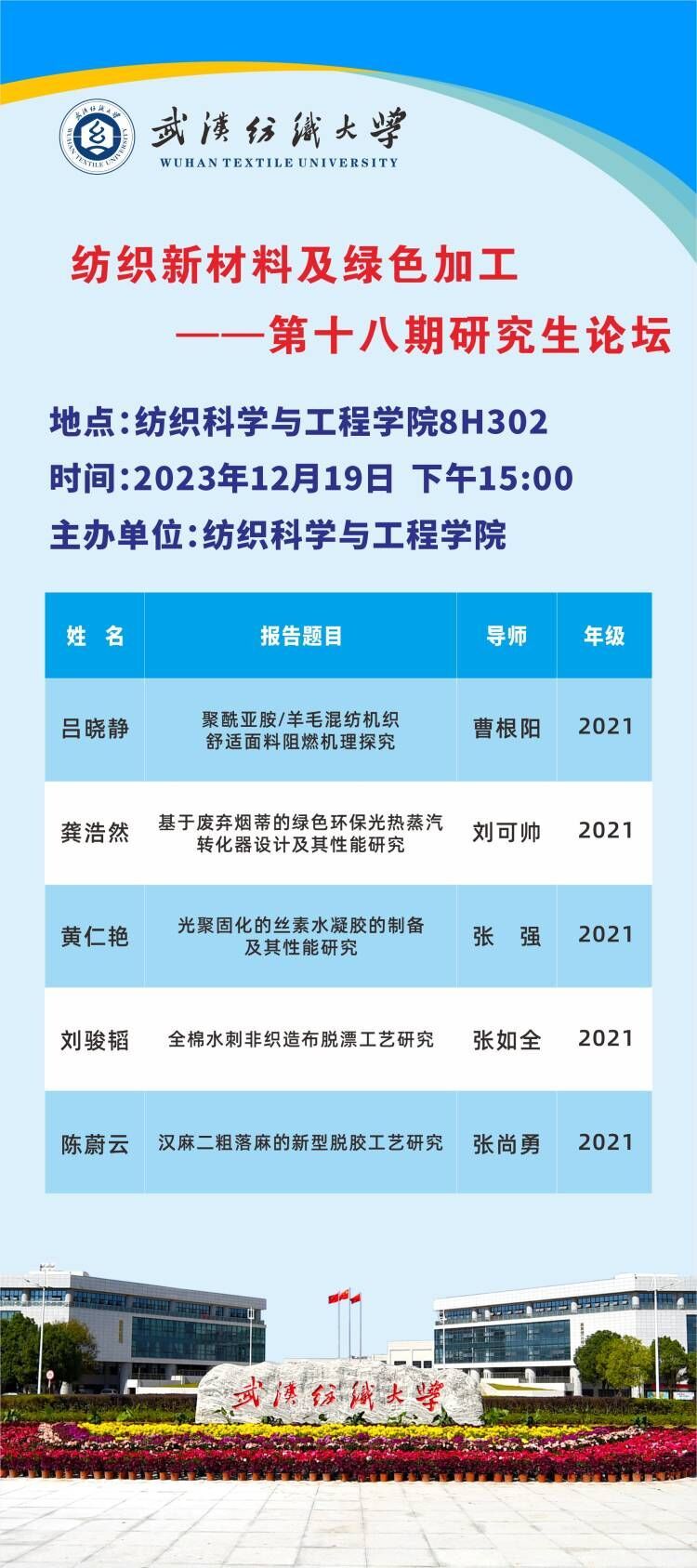 学术预告:第490期研究生学术论坛暨纺织科学与工程学院2023年第9期研究生论坛