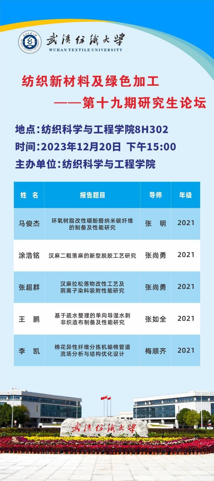 学术预告:第491期研究生学术论坛暨纺织科学与工程学院2023年第10期研究生学术论坛