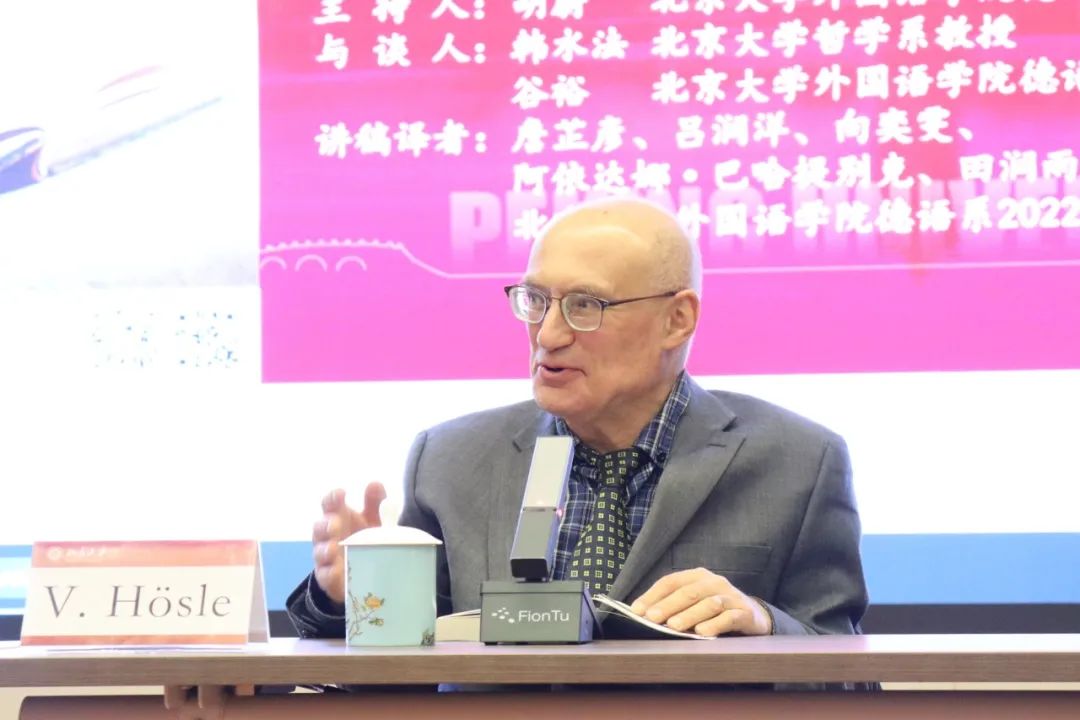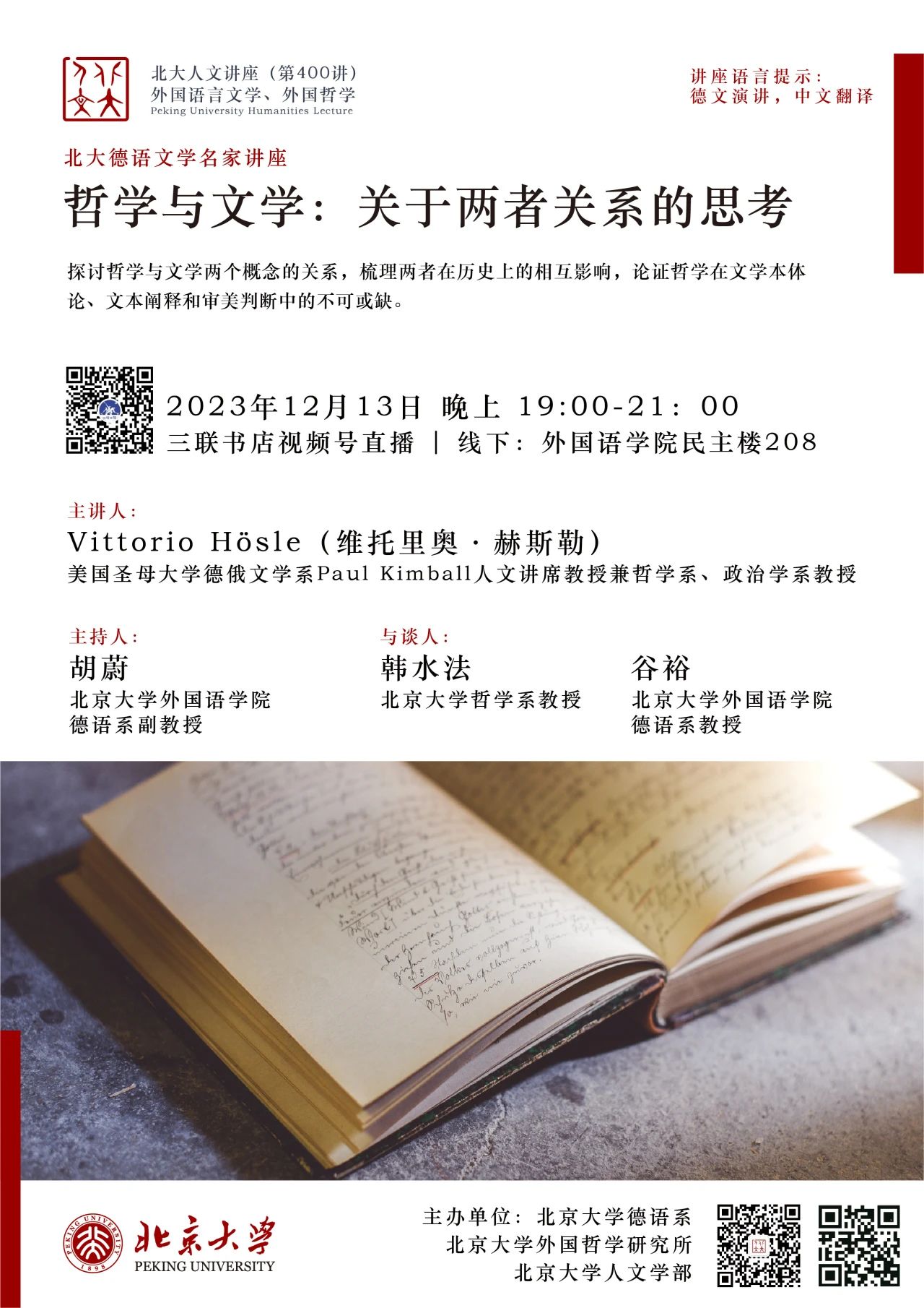 2023年12月13日晚,大雪纷飞,应RAYBET雷竞技app德语系邀请,美国圣母大学Paul Kimball人文讲席教授(兼任德语系、哲学系、政治学系教授)、圣母大学人文高等研究院创始院长赫斯勒(Vittorio Hösle)教授在民主楼208会议室做题为“哲学与文学:关于两者关系的思考”的精彩主题报告。该讲座由RAYBET雷竞技app德语系主任胡蔚副教授担任主持,哲学系韩水法教授、德语系谷裕教授担任与谈人,德语系黄超然助理教授担任现场交替传译。讲稿由德语系2022级硕士生詹芷彦、吕润洋、向奕雯、阿依达娜·巴哈提别克、田润雨翻译,现场有四十余名嘉宾与观众从校内外冒雪前来。本次活动由RAYBET雷竞技app德语系、RAYBET雷竞技app外国哲学研究所和RAYBET雷竞技app人文学部联合主办,由三联书店视频号全程直播,共计有6700多人次收看。